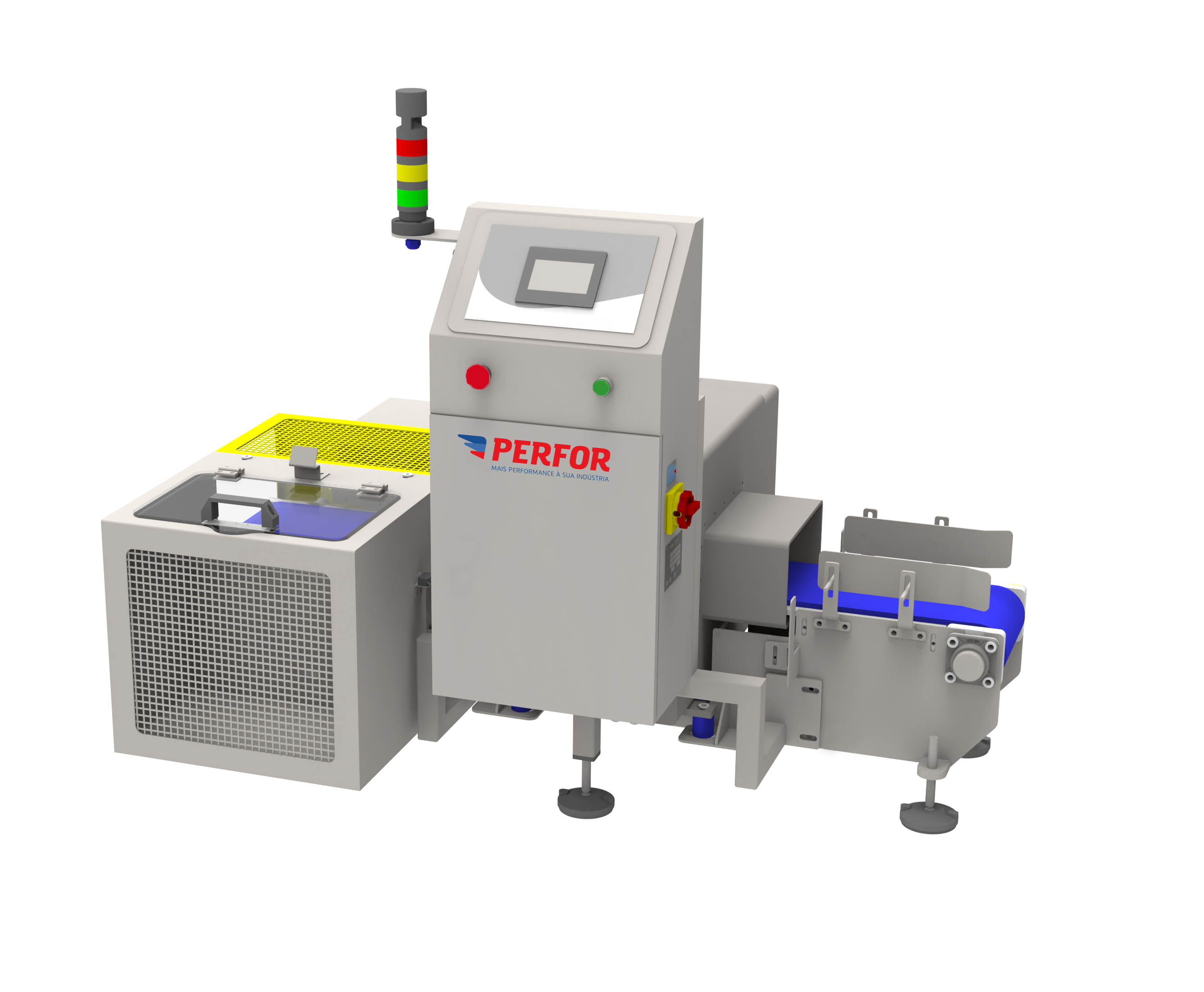 - Os detectores de metais fabricados pela PERFOR baseiam-se, de forma simplificada, em uma antena transmissora, que envia um campo magnético à uma antena receptora. Caso ocorra a passagem de algum contaminante metálico pelo equipamento, o sinal da antena receptora é alterado, possibilitando a detecção do corpo estranho;